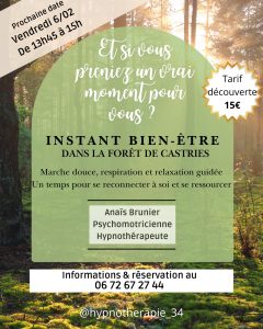 Je vous propose des séances relax / bien-être en nature : il s’agit de se retrouver pour une séance collective, mi-hypnose, mi-méditation pleine conscience.